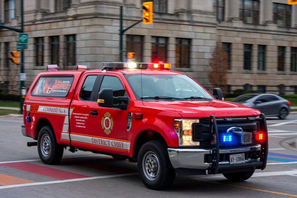 One of my walks from the parking lot to work, this London Fire Department vehicle headed by on the way to a call.